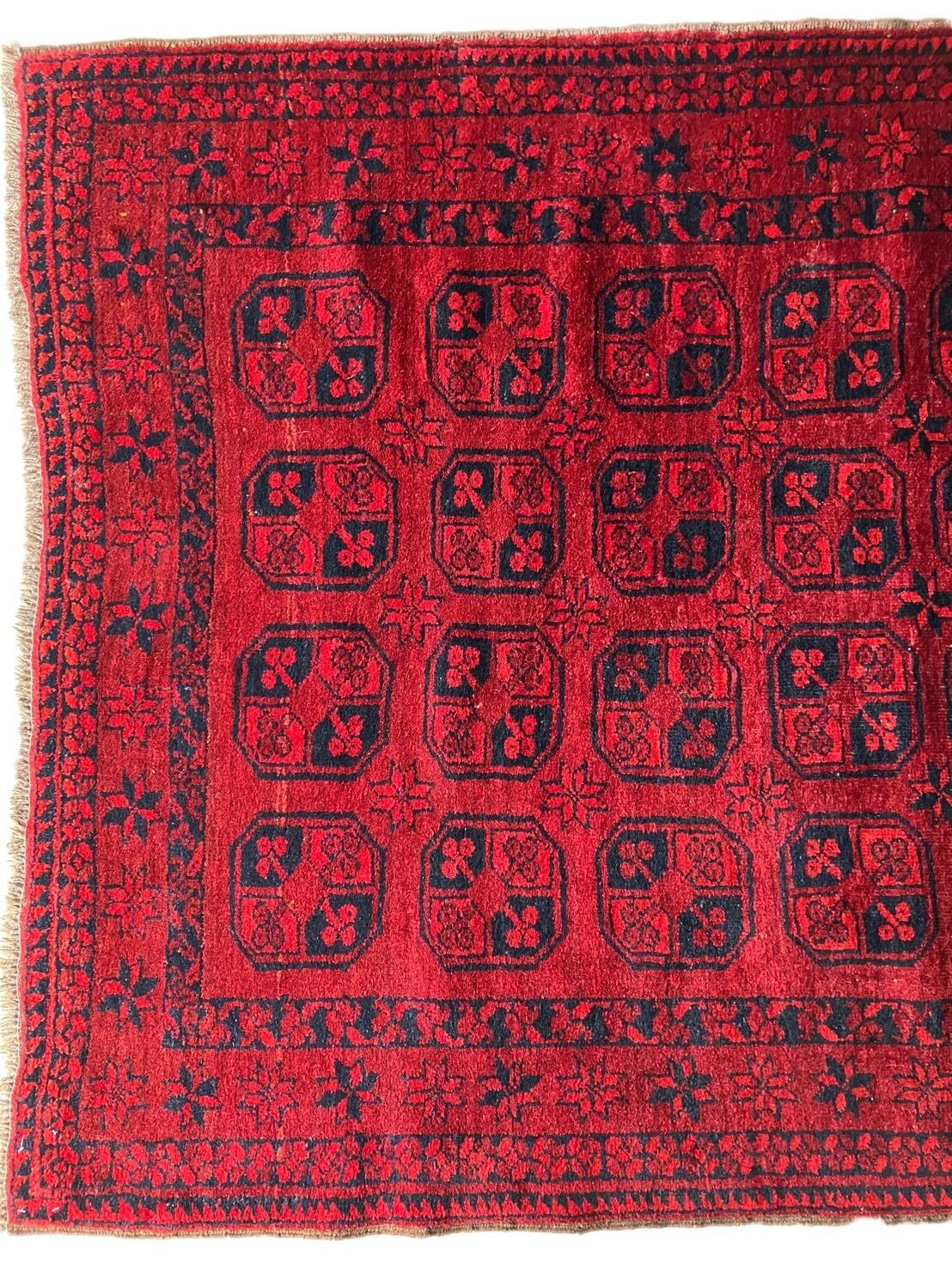タガングル柄のアクチャ絨毯です。メインにはシンプルなフィルポイ柄のデザインが使われています。ラビンジャーの特徴であるキリムエンドに柄が施されていて、織りがとてもしっかりとしています。しっかりとした厚みがあり、ルックスはもちろん、使い続ければ使うほど愛着の湧く一品です。