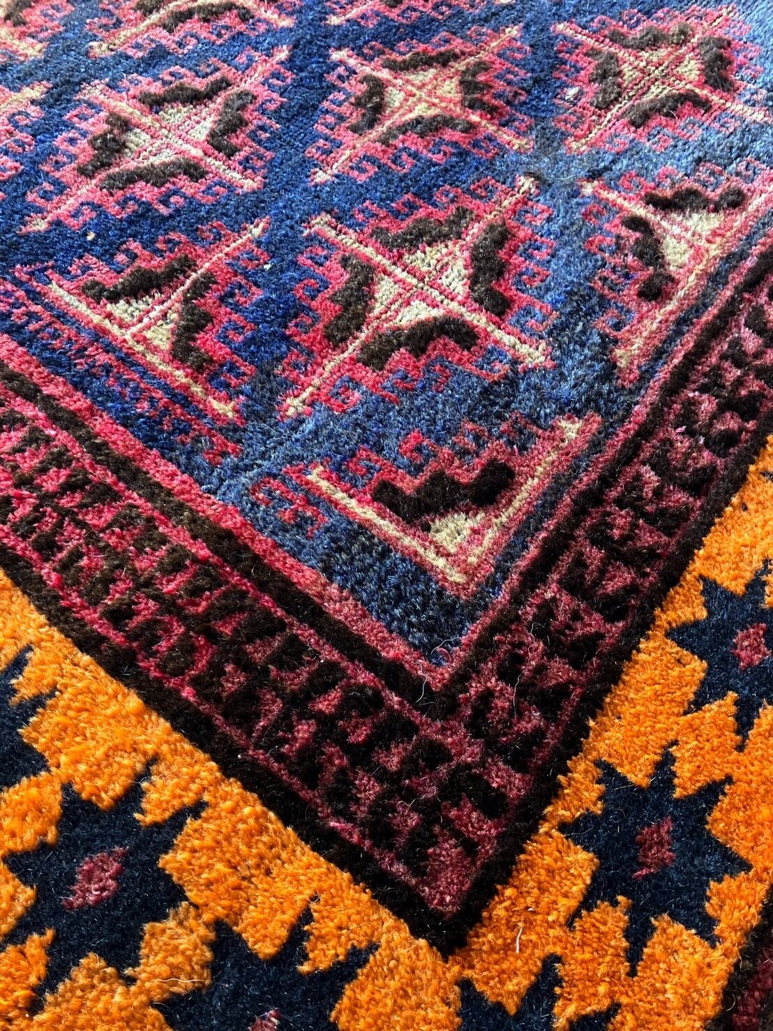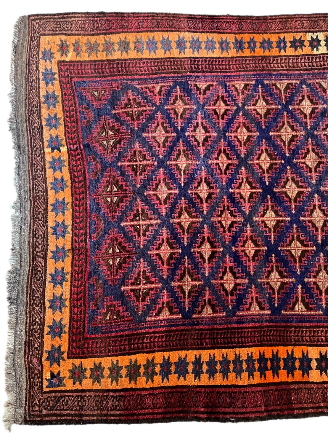 タイマニ族のバルーチ絨毯。オレンジ色のボーダーにはタイマニによくみられる星柄のデザインが使われています。毛は短いですが使い続けられたことにより柄がより立体的に映え、毛に美しい光沢が現れています。程良い具合に育て上げられた素晴らしい品です。ラバキには山羊の毛が使われています。