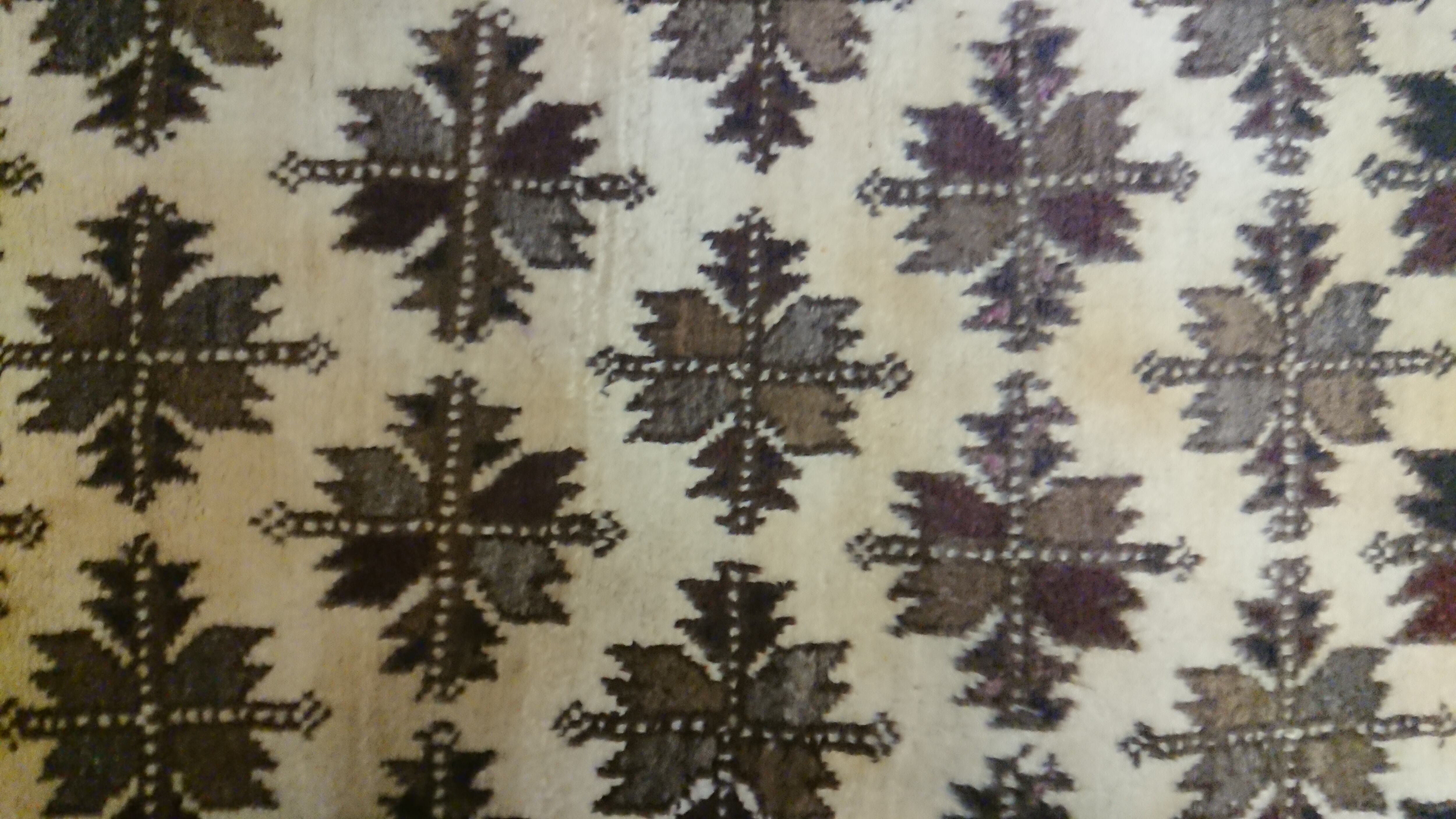 タイマニ族のバルーチ絨毯です。メインの柄は生命樹の葉の柄で、ボーダーには山羊の角柄が使われています。毛足が長く、状態の良いデッドストック品です。地毛の落ち着いたシンプルな色合いは様々な家具との相性も良いです。