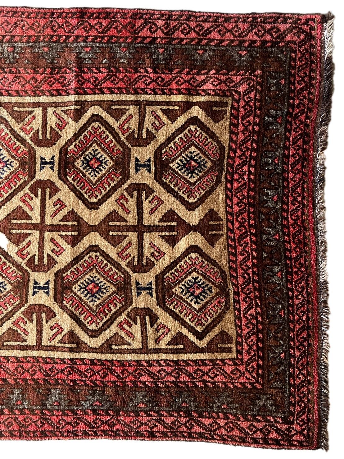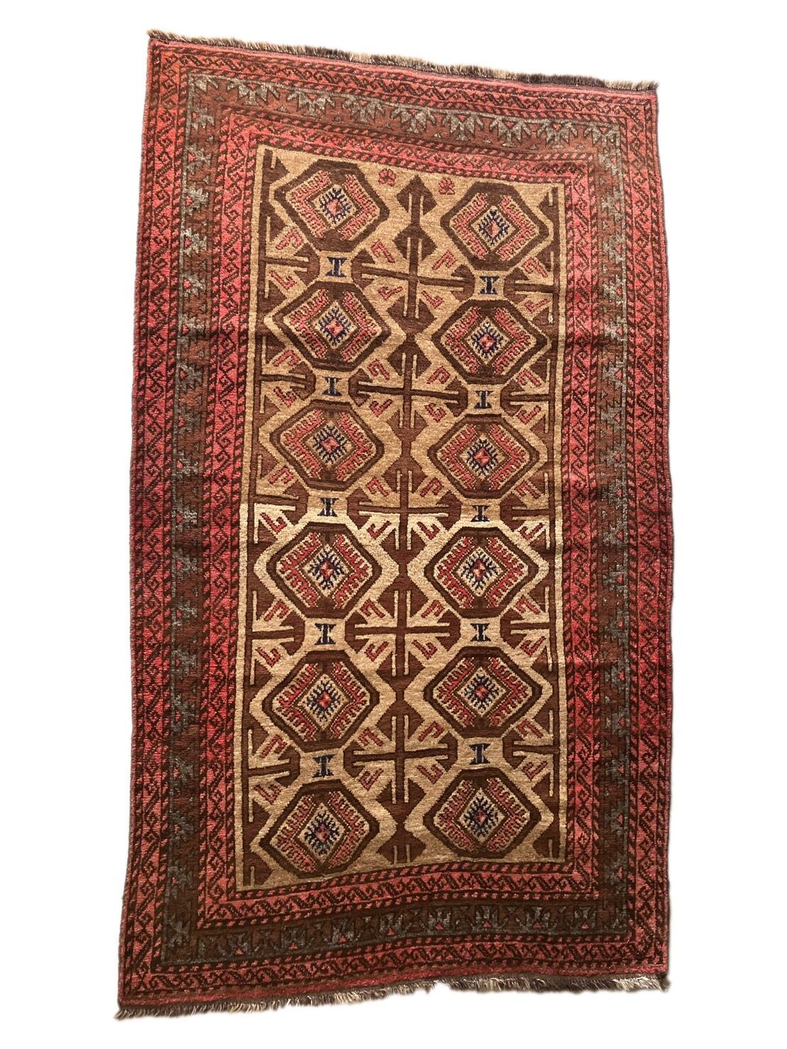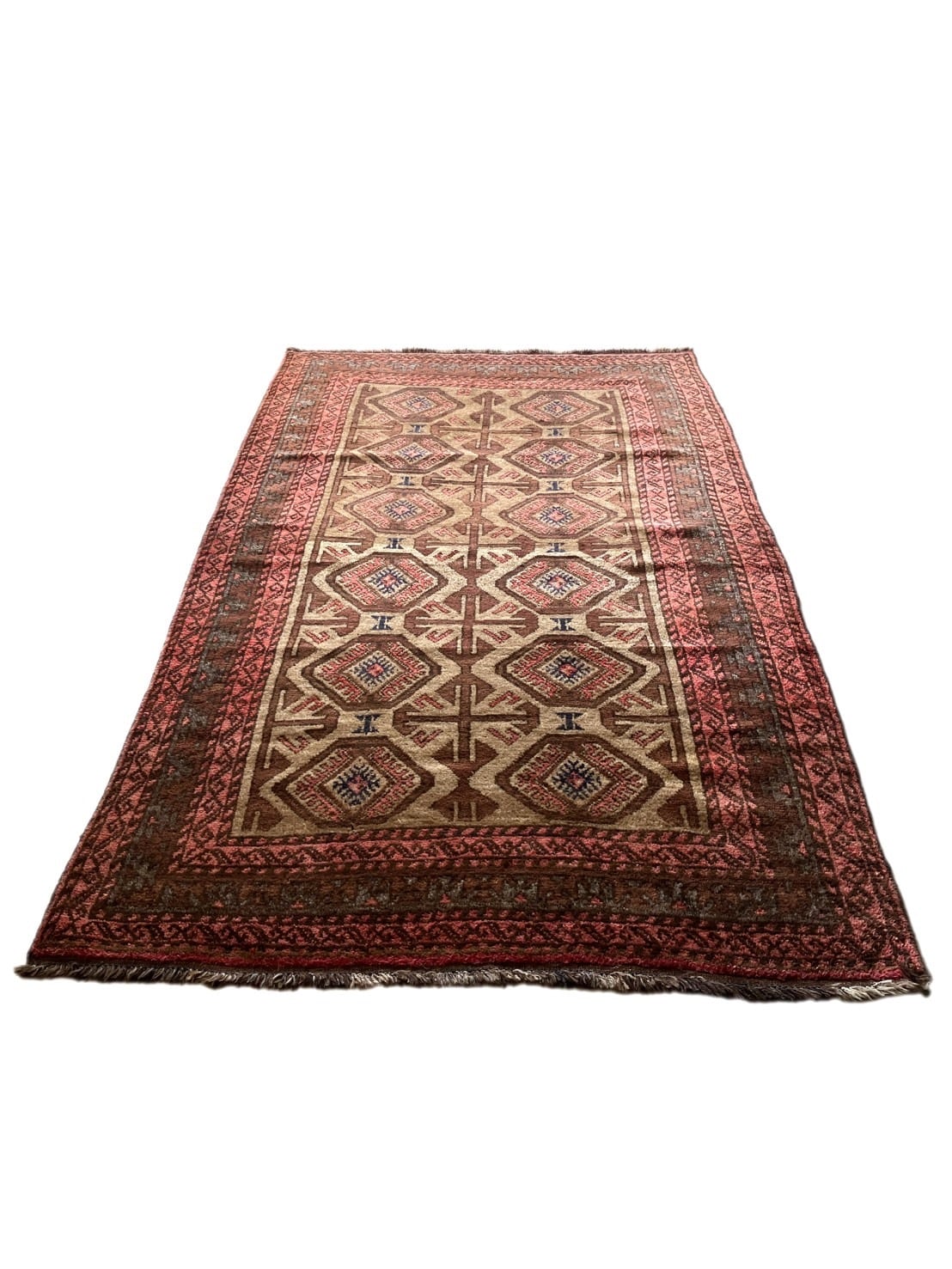マールダーリーのバルーチ絨毯です。地の地毛の茶がメインの柄の赤茶を引き立てています。全体のバランスと打ち込みが良く、毛足と羊毛の質がよい素晴らしい絨毯です。シンプルながらも個性のある色使いでどんな部屋でも調和してくれる一品です。