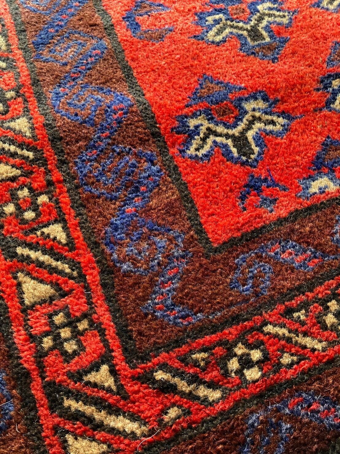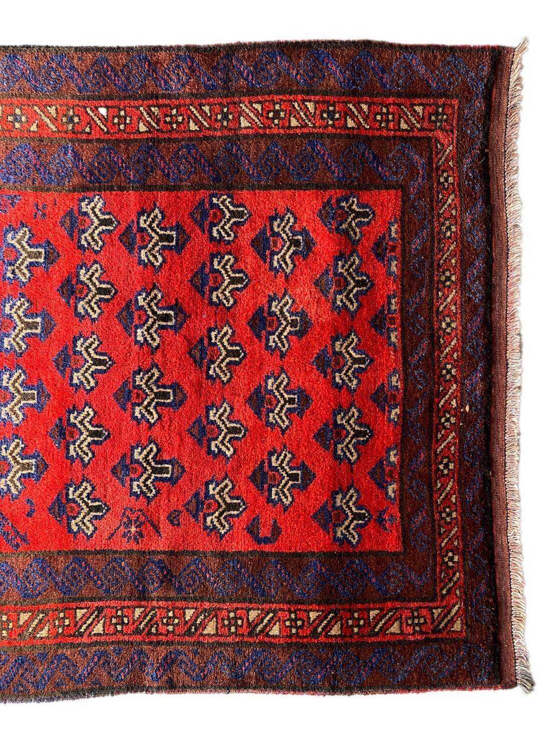 マールダーリーのバルーチ絨毯です。メインにはドフタレクァズィー柄のモチーフを使った柄が施されています。織りは少し粗めですが、柄と色のバランスがとても美しい品です。