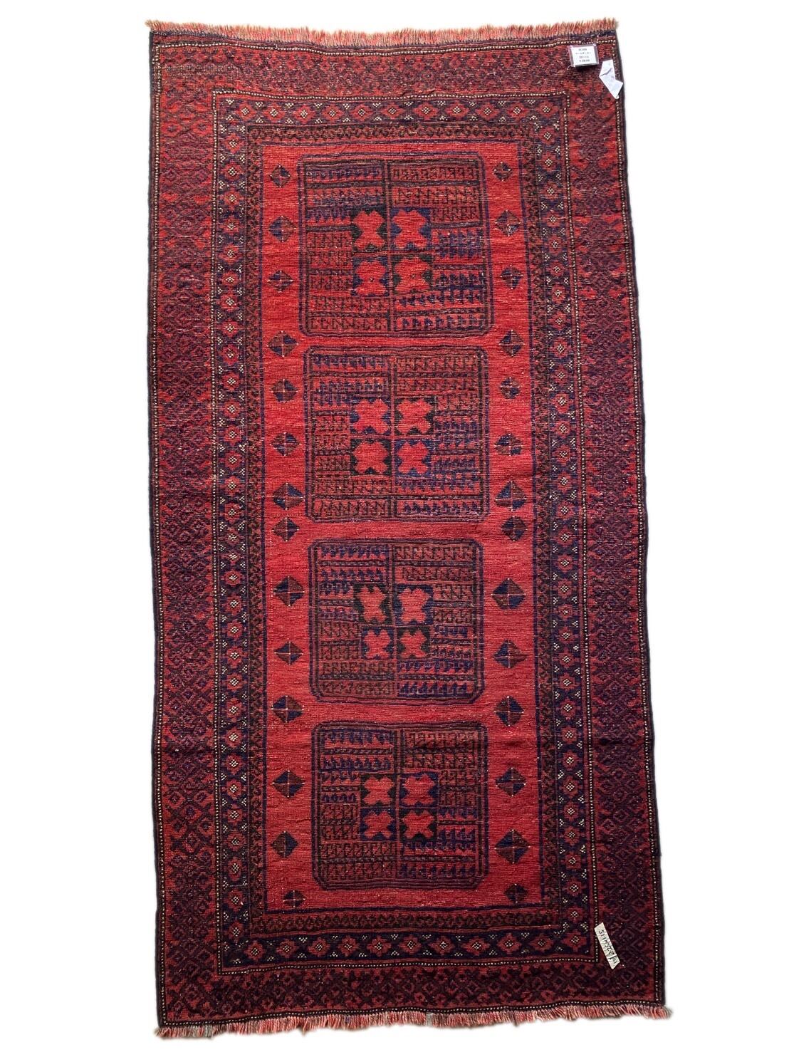 マールダーリーのバルーチ絨毯です。メインの柄はトルクメン風ですが、ボーダーにはバスタニ柄が使われているユニークな品です。シンプルな配色ながらも柄には個性が良く出ていて、親しみやすいルックスです。5~60年前のものですが。毛足が長く織りも良い絨毯です。