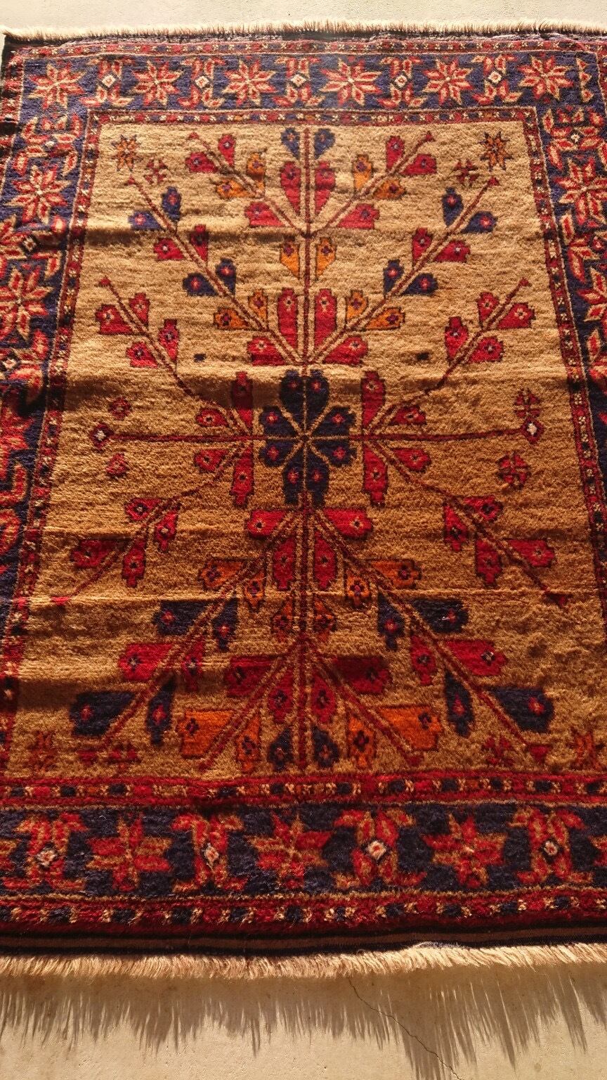 メインの花の柄が印象的なバルーチ絨毯です。4~50年前のものですが織りが良く、ほぼ未使用の状態の良い品です。