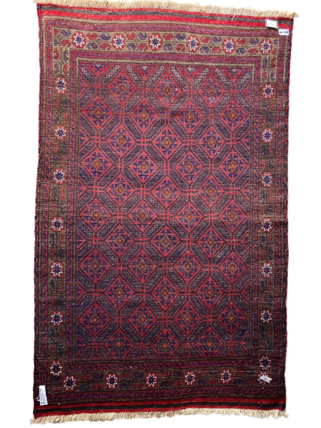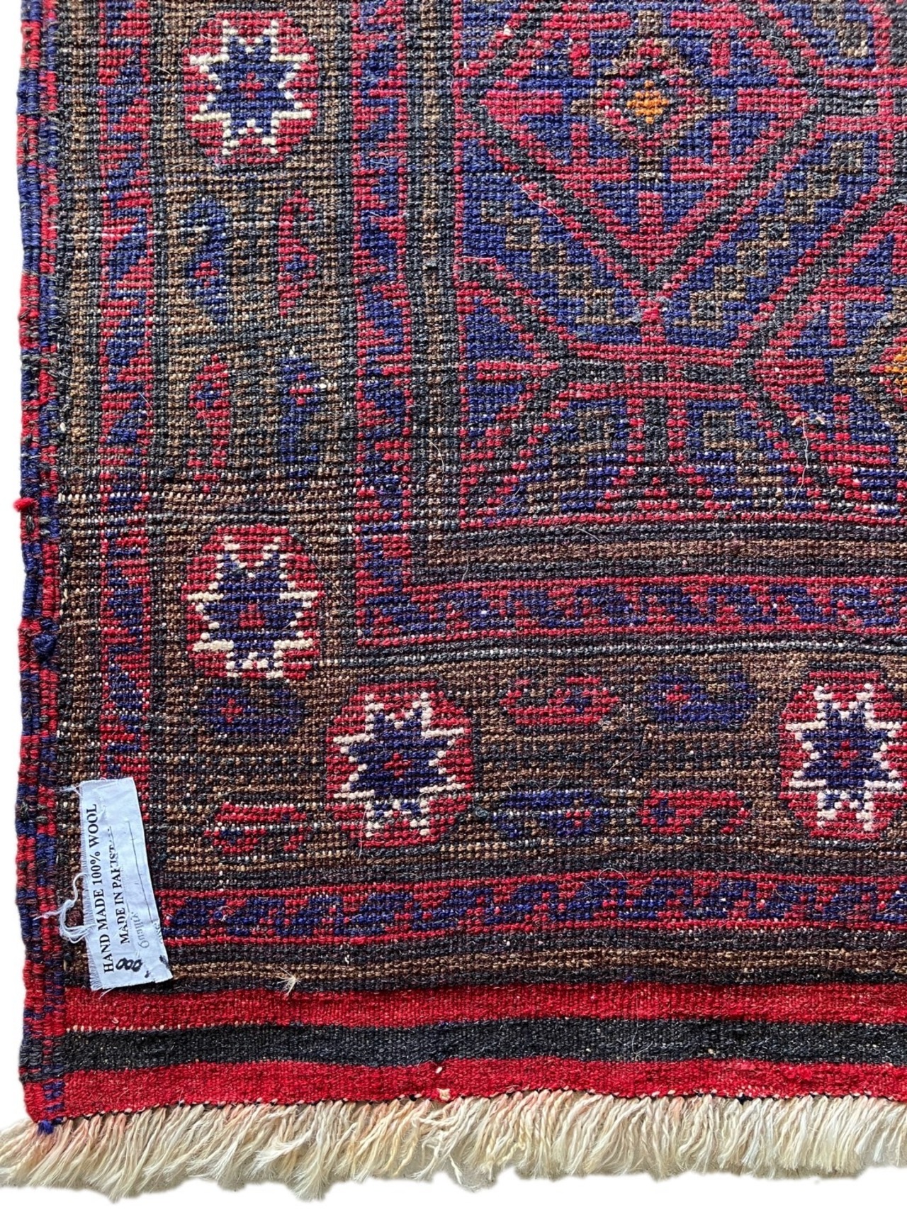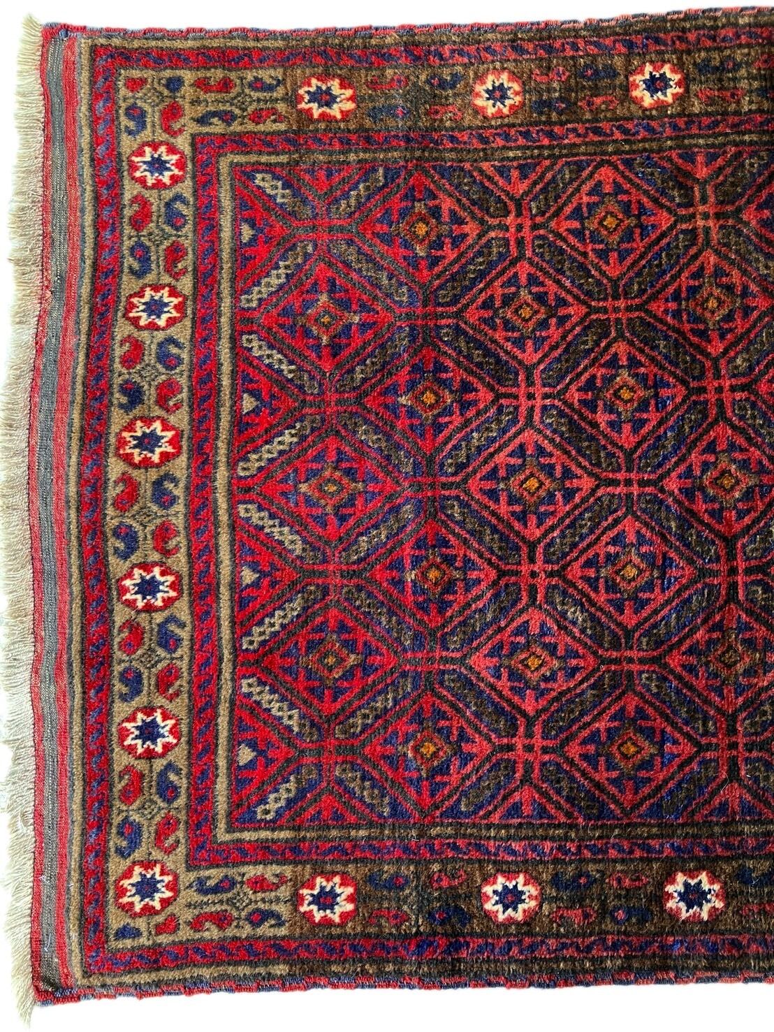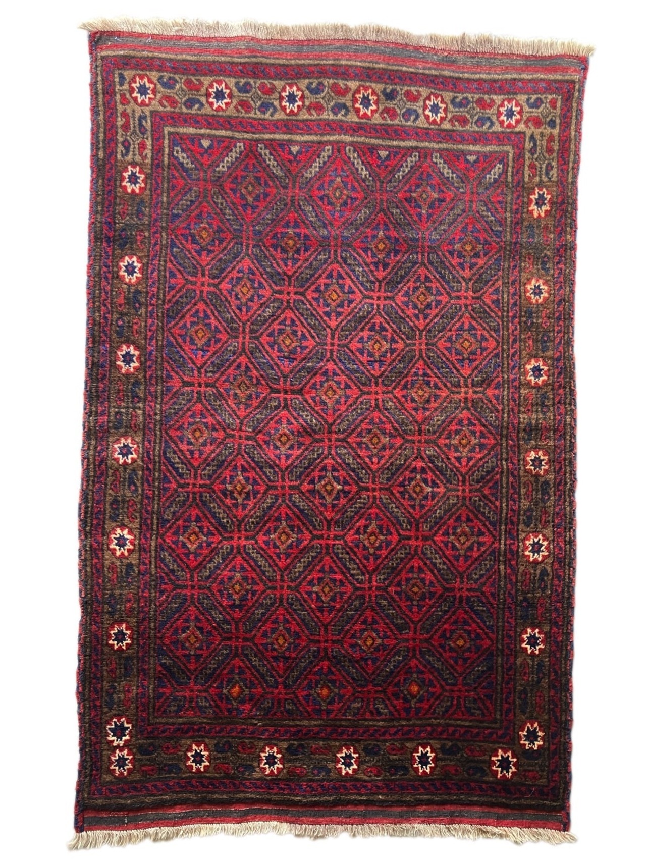 タイマニ族のバルーチ絨毯です。ボーダーには星とアーモンド柄のデザインが使われています。毛足は長く、使用感のない状態の良い品になります。