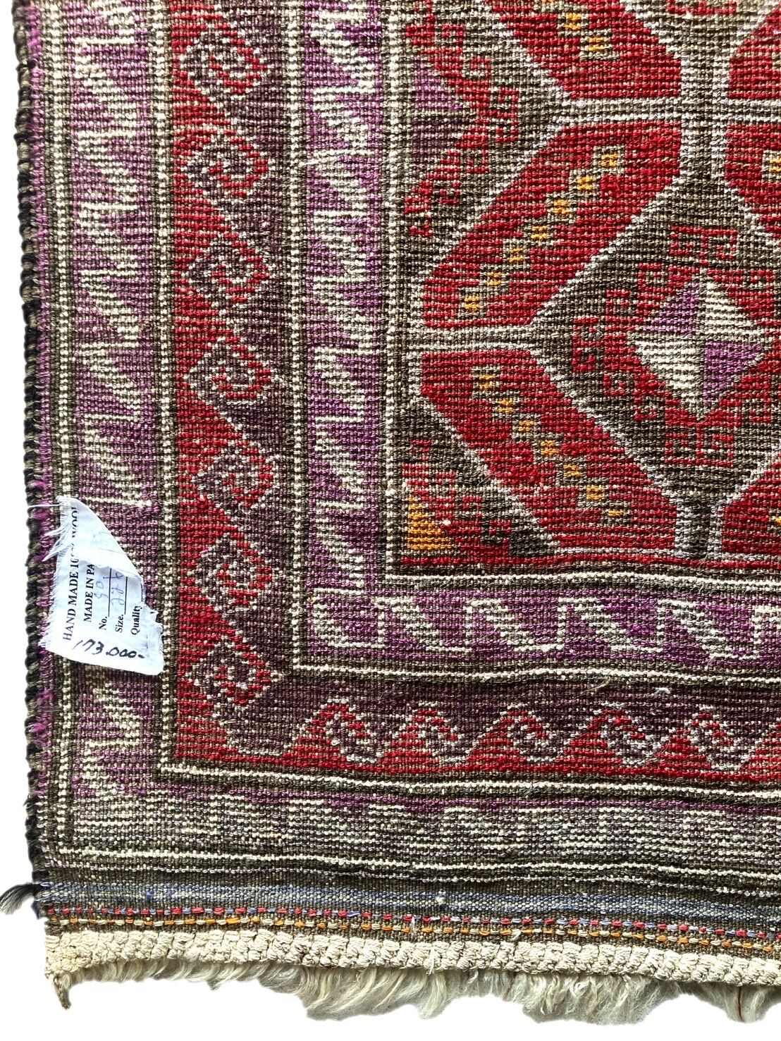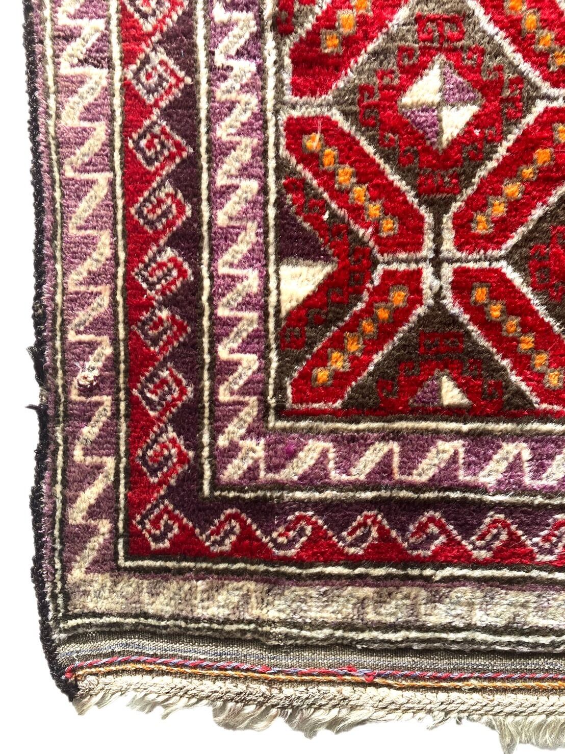 タイマニ族のバルーチ絨毯です。全体の鮮やかな赤と紫のバランスが良い目を惹く美しい絨毯です。ラバキは山羊の毛を使用しており丈夫です。部屋に一枚敷くだけで雰囲気を変えてくれる一品です。