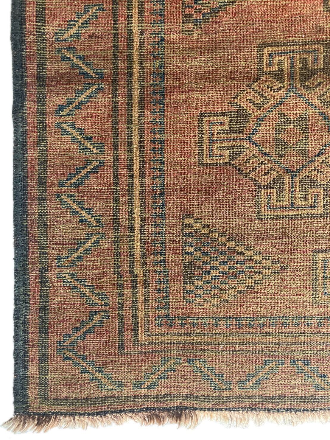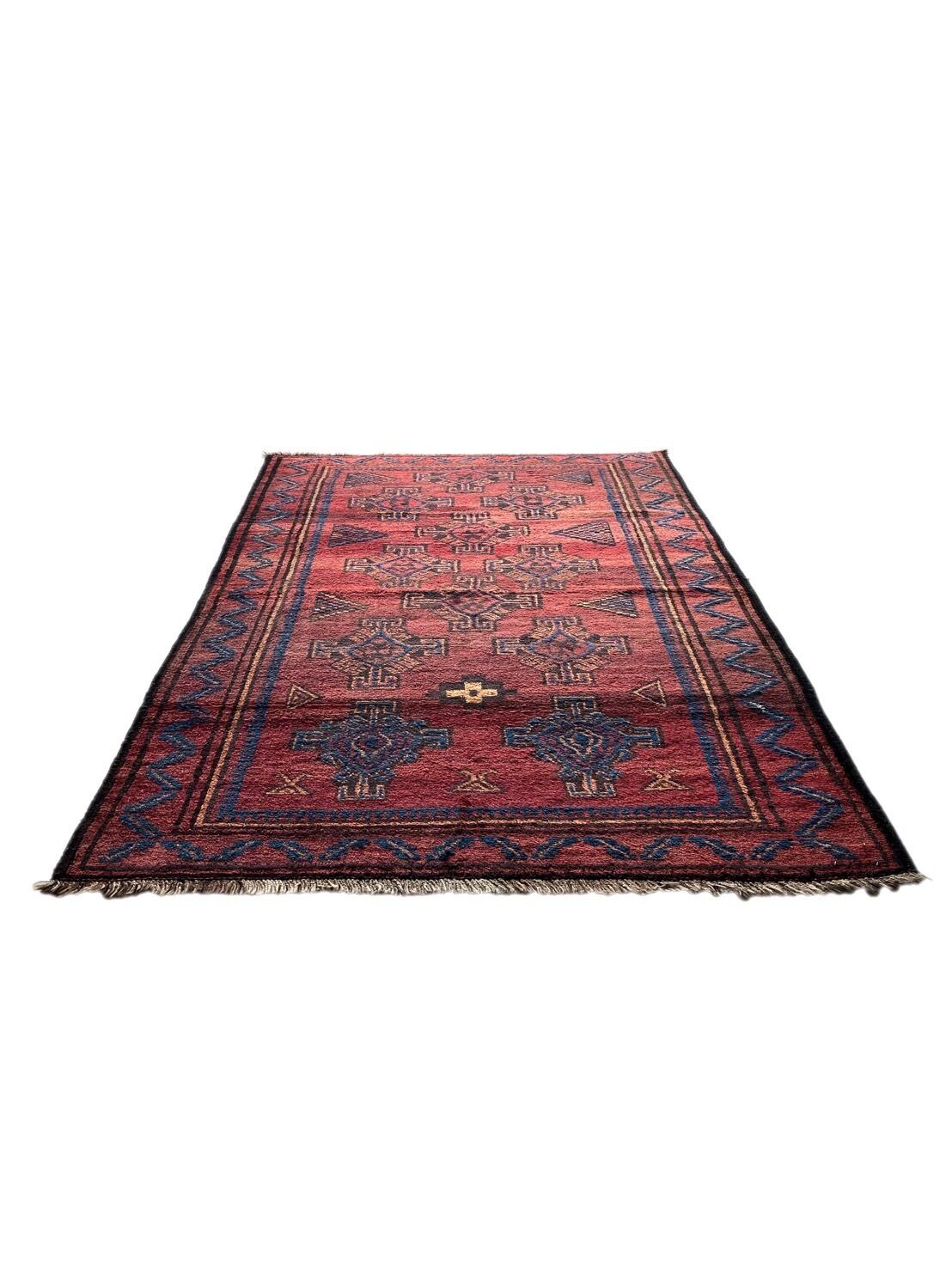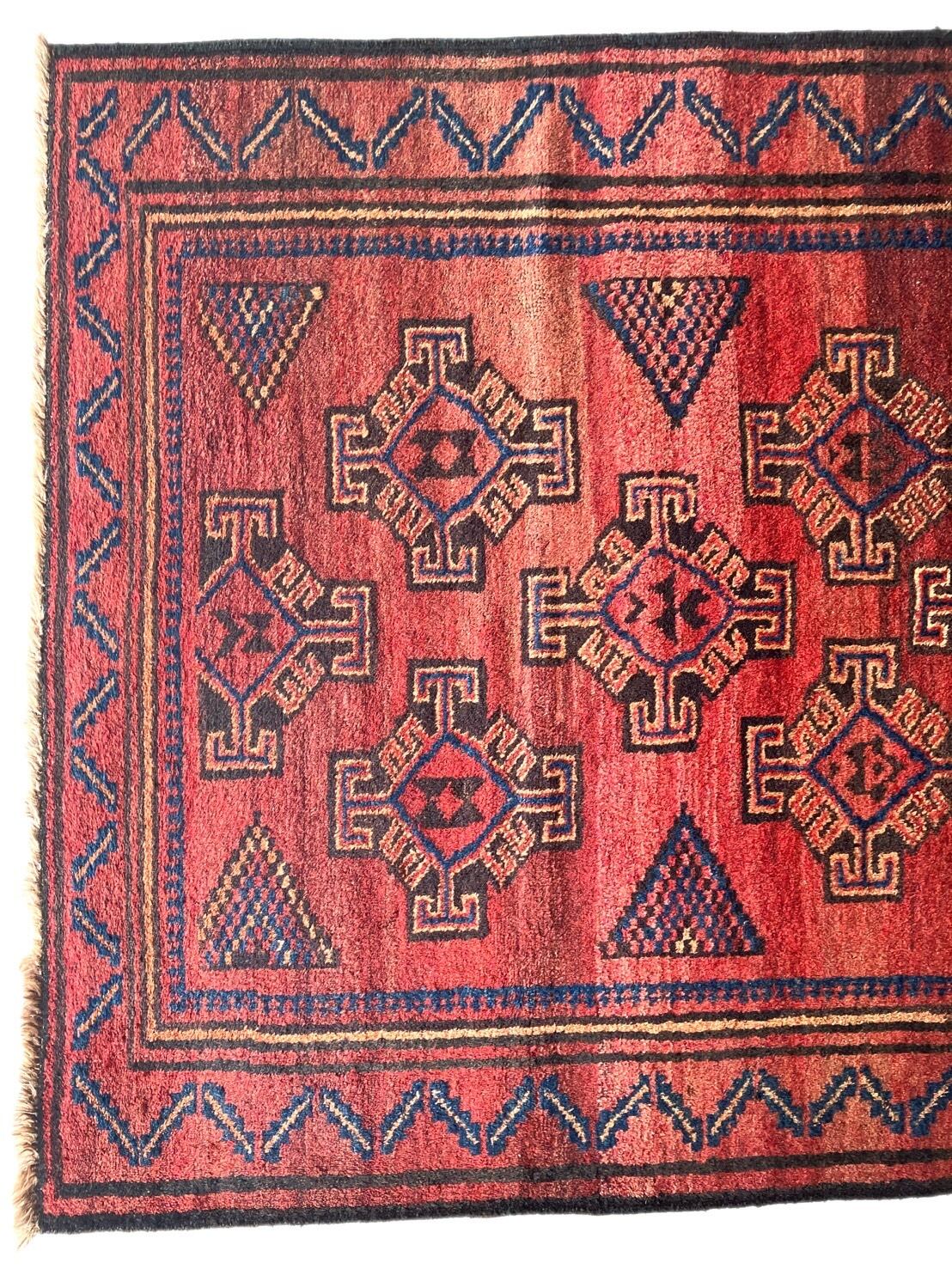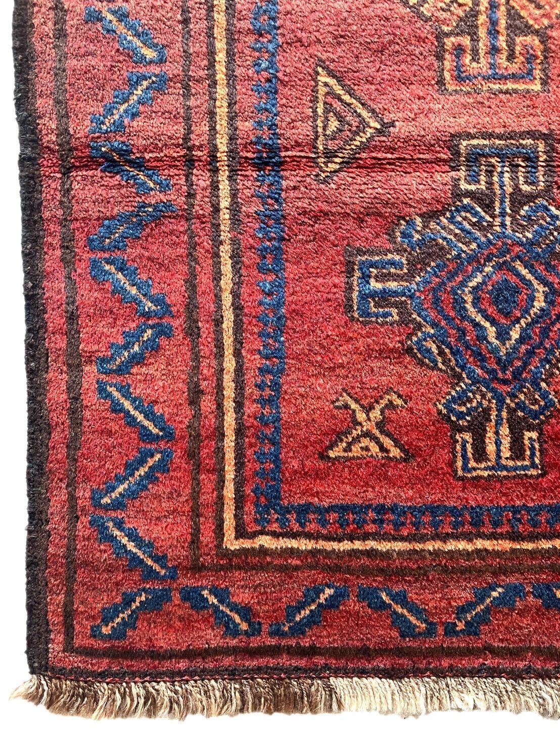フィロズコヒ族のバルーチ絨毯です。柄は他の民族を模倣したもので、良い具合に小慣れています。地の茜の赤とインディゴの紺がとても綺麗に映えていて、力強さを感じます。フリンジの始末も丁寧で良い品です。