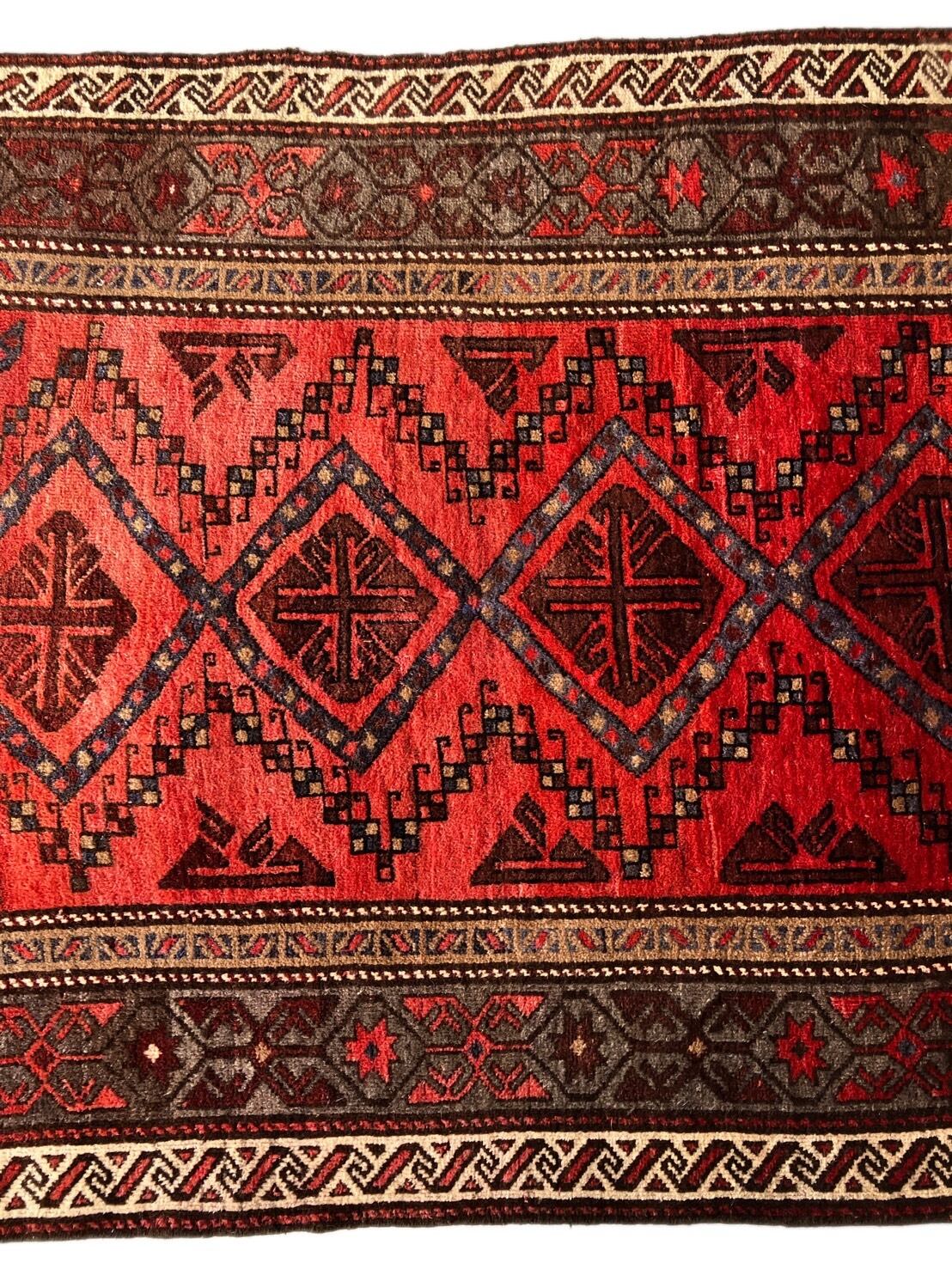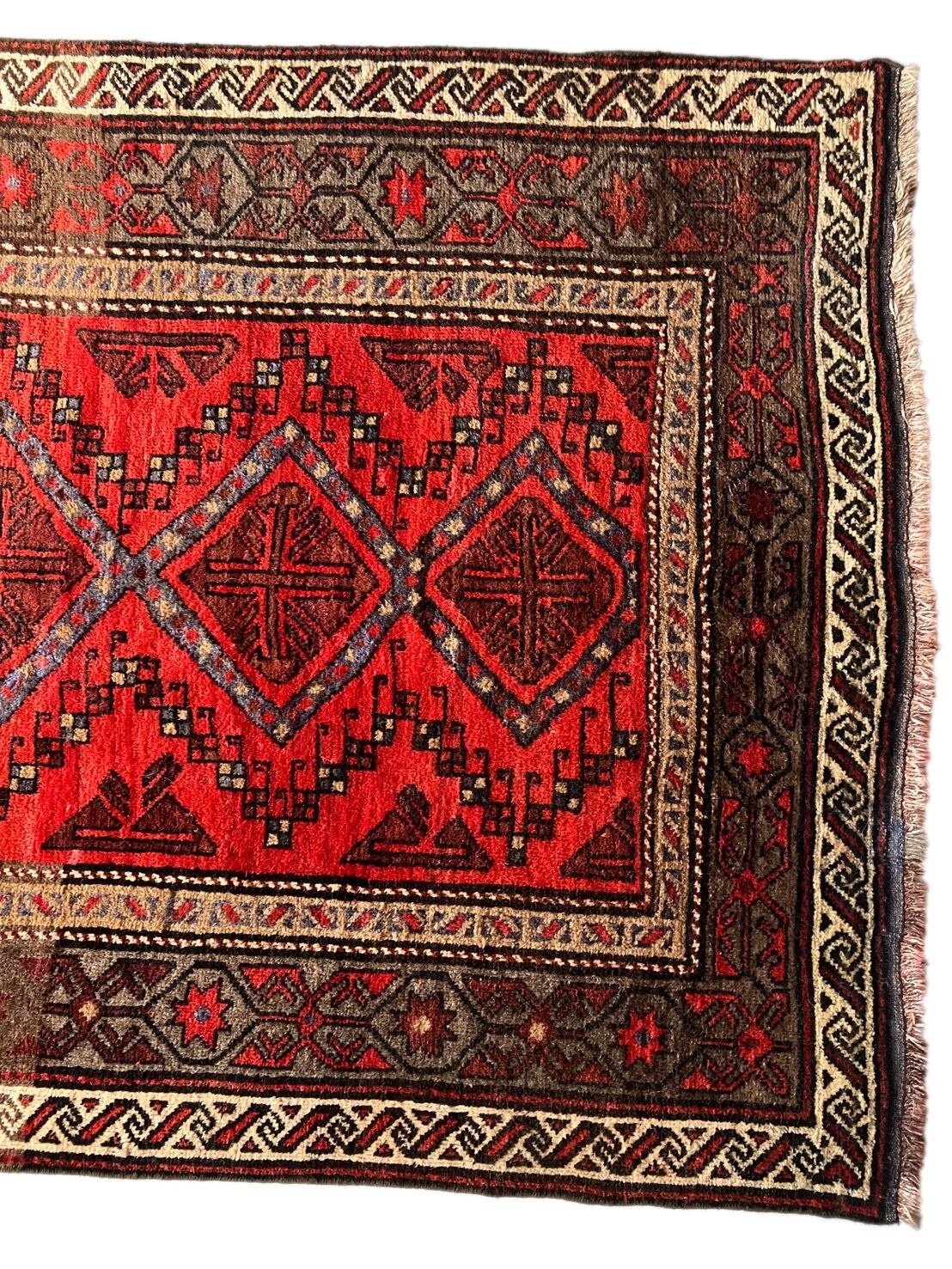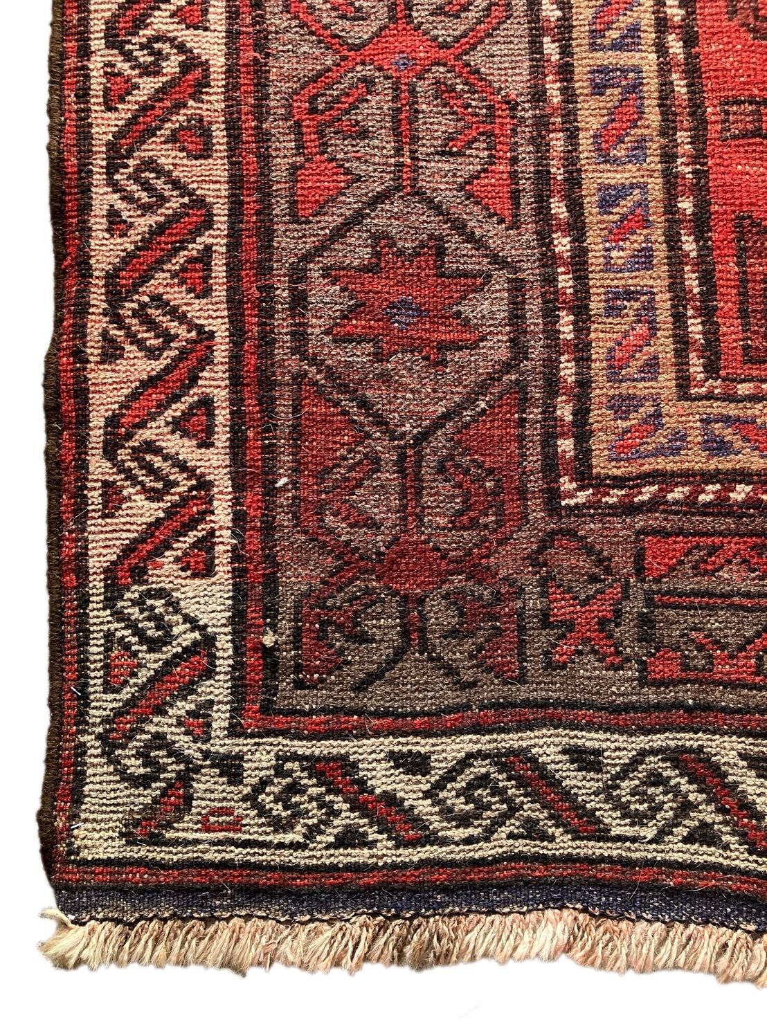 マールーダーリーのバルーチ絨毯です。天然染料で染められた羊毛と白とグレーの地毛、さらには茶色のラクダの毛で織られた素晴らしい品です。70年程前のもので横糸は赤く染められた糸を使いざっくりめに織り上げられています。サイズと柄に存在感はあるものも、落ち着いた色味で様々な部屋にお使いいただける一品です。