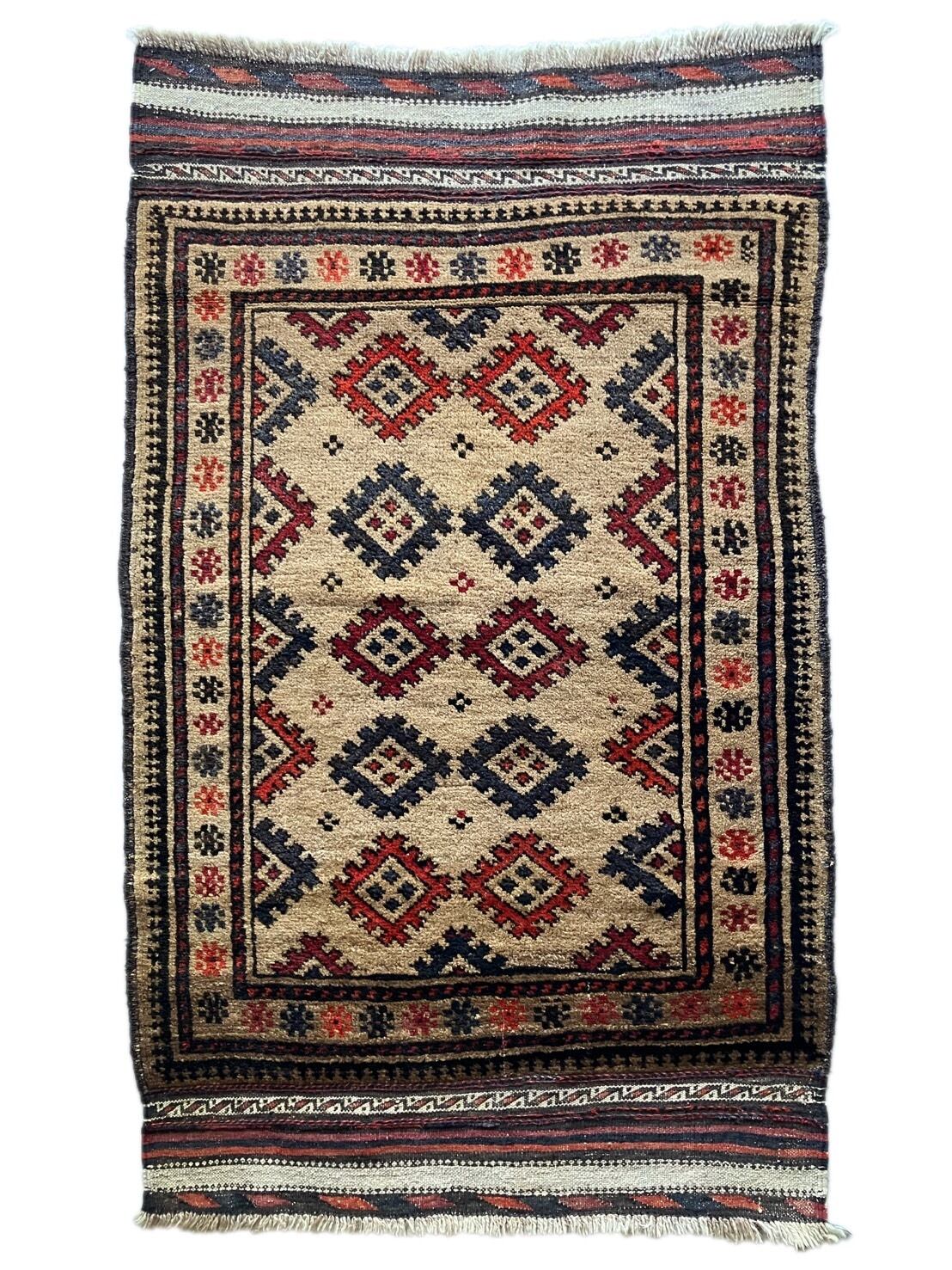 ゴルマージで織られたバルーチ絨毯です。柄はタイマニ族の柄を模倣したデザインです。ゴルマージの特徴である長いキリムエンドがみられます。40年程前のもので、ラバキには山羊の毛を使用していて丈夫です。