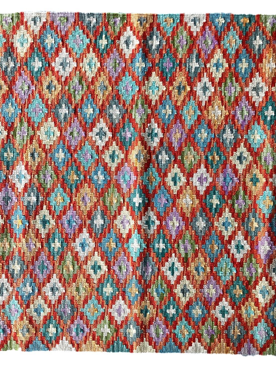 マイマナキリムの最近織られたものです。元来落ち着いた色目のものばかりでしたが、最近の糸の色ムラを使い、トルコキリムの様な色目の糸で織ったものです。ギャッベのどの絨毯で良くみられ、アブラッシュと呼ばれています。