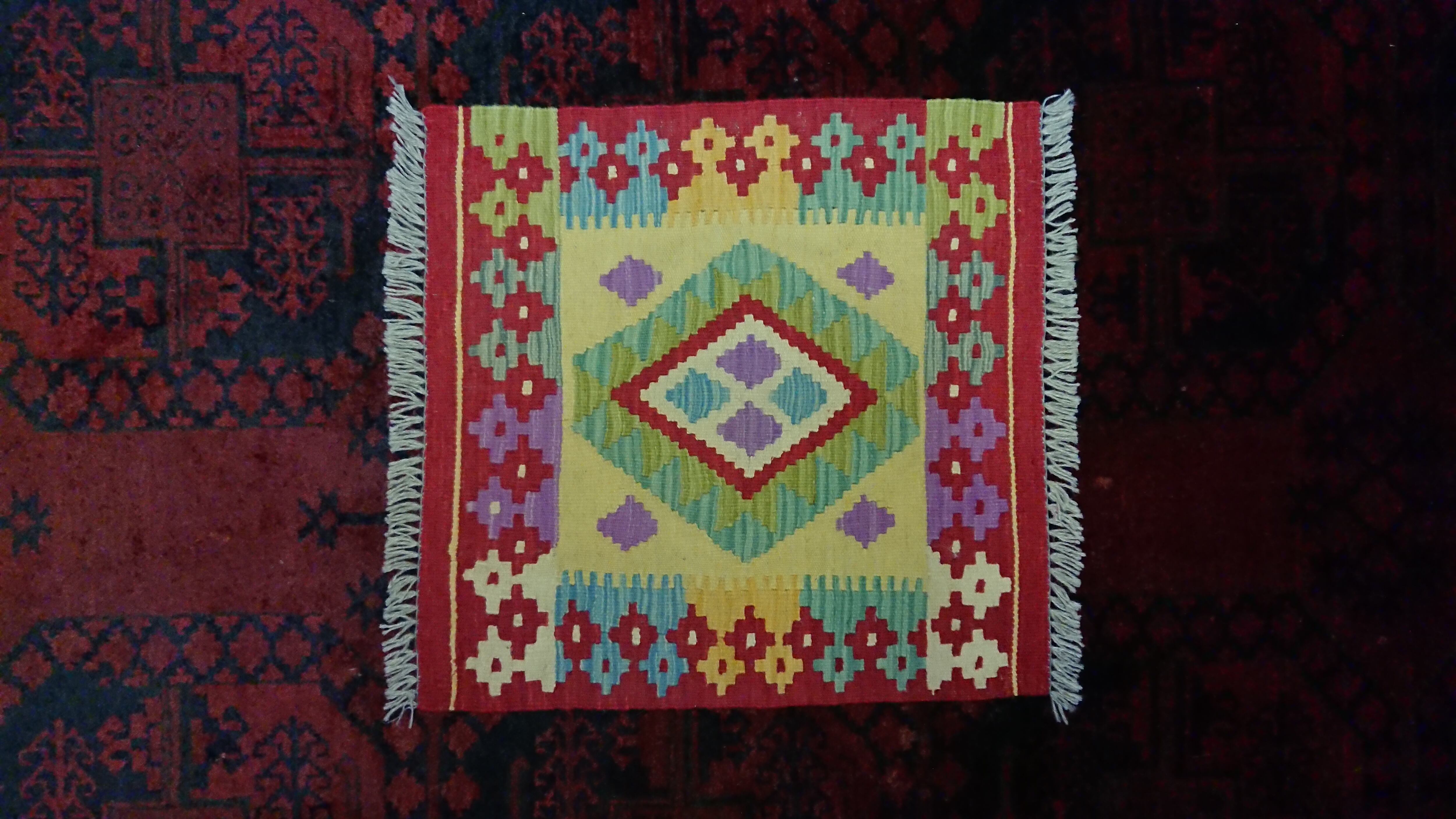 マイマナキリムの最近織られたものです。元来落ち着いた色目のものばかりでしたが、最近の糸の色ムラを使い、トルコキリムの様な色目の糸で織ったものです。ギャッベのどの絨毯で良くみられ、アブラッシュと呼ばれています。